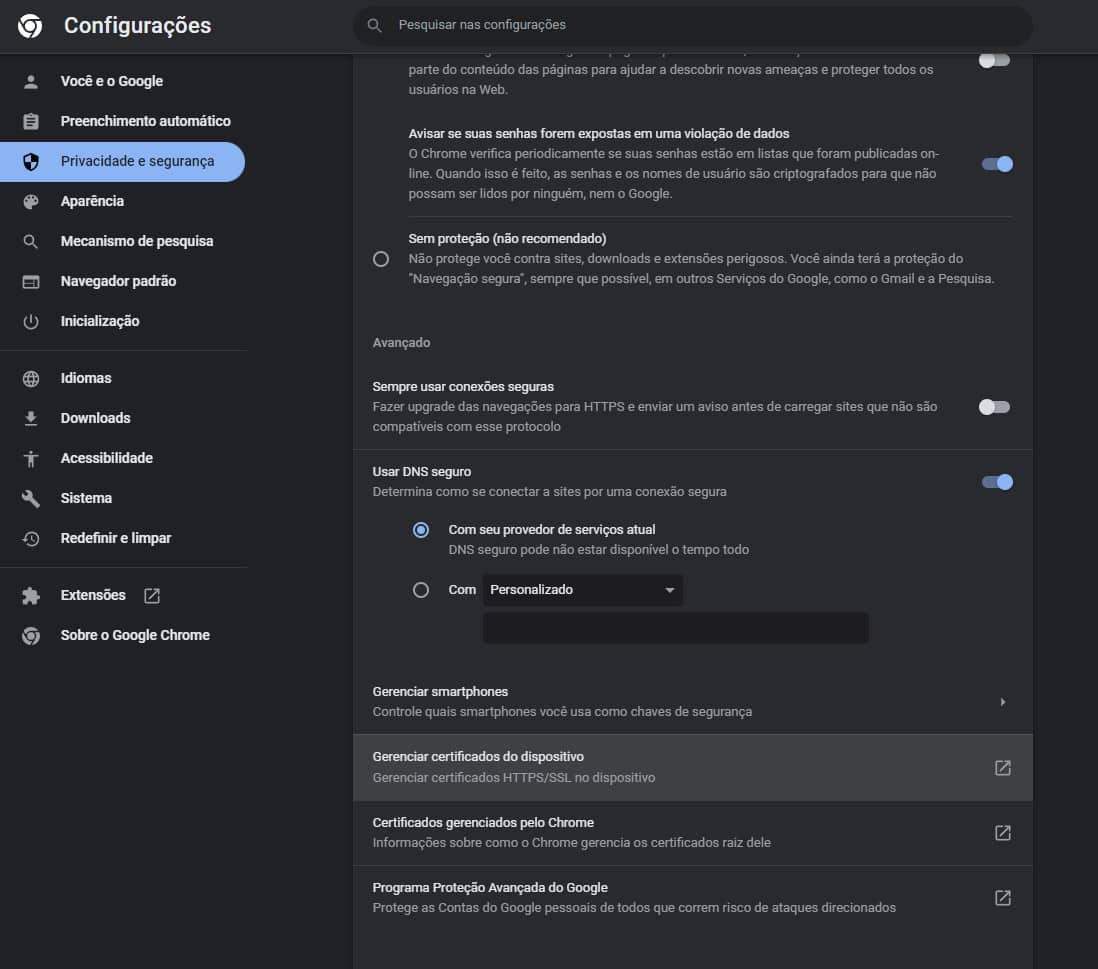 1. Logo após, role a barra até encontrar a opção: Gerenciar certificados do dispositivo;