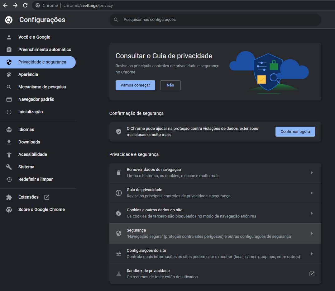 4. Selecione a terceira opção do menu: Privacidade e segurança;