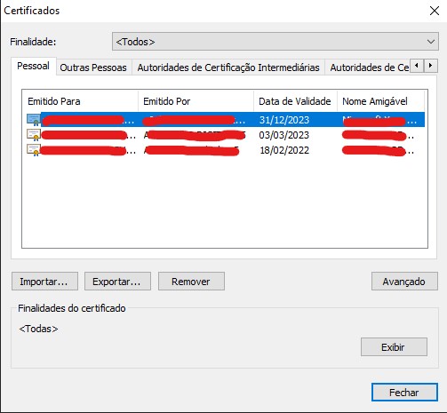 Para você excluir um certificado digital vencido basta seguir qualquer um dos caminhos passados anteriormente, até chegar no gerenciador de certificados. Como você pode ver na imagem abaixo.