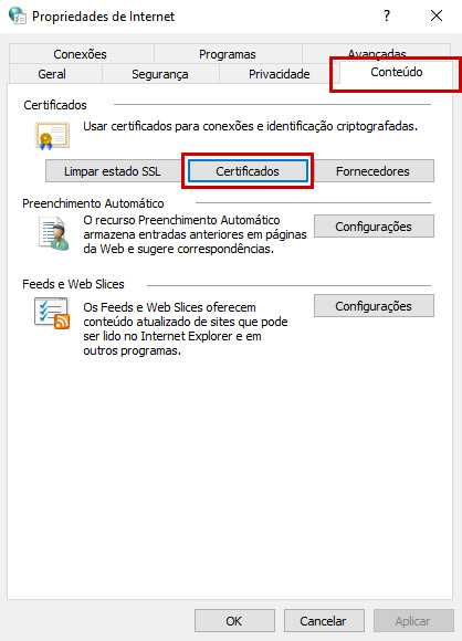 2. Selecione a aba Conteúdo; e em seguida opte pela opção de Certificados (como na imagem abaixo);