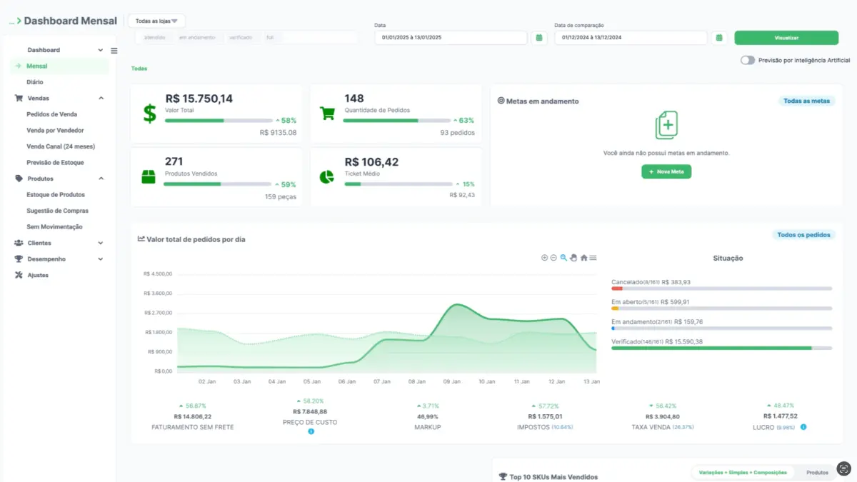 O dashboard mensal do Bling facilita o monitoramento dessas informações do seu negócio com gráficos claros.