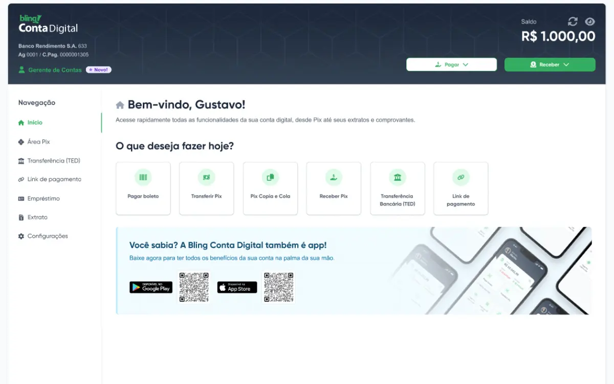 Para facilitar seus processos financeiros, abra uma Bling Conta Digital. Além de organizar o dinheiro da pessoa física e jurídica, a plataforma automatiza tarefas, como emissão de boletos, pagamento de contas, consulta de saldos e acompanhamento das movimentações pelo internet banking Bling.
