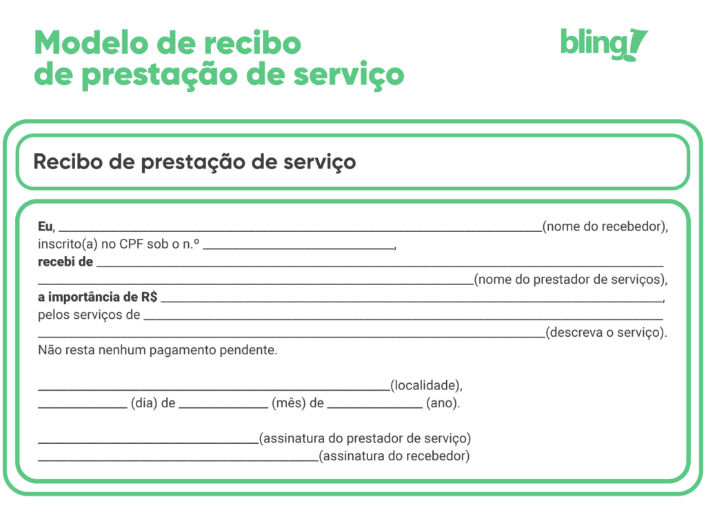 Eu, ______________________________ (nome do recebedor), inscrito(a) no CPF sob o n.º ___________________ recebi de _______________________________ (nome do prestador de serviços), a importância de R$ _________, pelos serviços de ______________________________________________________ (descreva o serviço). Não resta nenhum pagamento pendente.