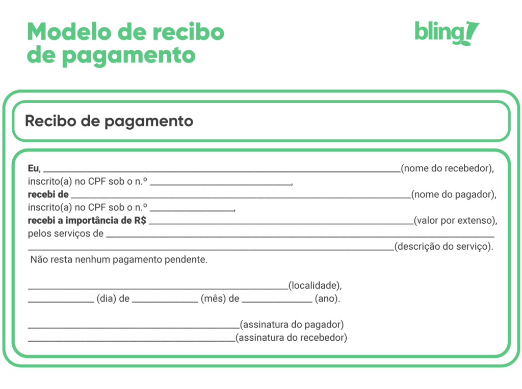 Eu, ______________(nome do recebedor), inscrito(a) no CPF sob o n.º _______________, recebi de _____________________(nome do pagador), inscrito(a) no CPF sob o n.º ___________________, recebi a importância de R$ __________(valor por extenso), pelos serviços de ____________________________________________(descrição do serviço). Não resta nenhum pagamento pendente.