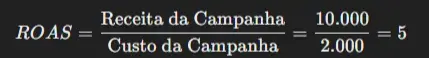 Neste exemplo, o resultado do ROAS é 5, o que significa que, para cada R$ 1,00 em publicidade, a empresa gerou R$ 5,00 em vendas.