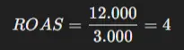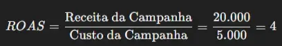 Uma loja on-line gasta R$ 5.000,00 em campanhas de Google Ads. Como resultado, obtém R$ 20.000,00 em vendas. Aqui, o cálculo é assim: